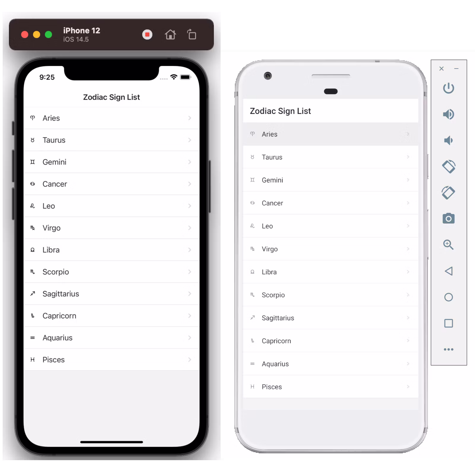 This example uses icons from Material Community Icons. You need to create a list that contains the zodiac sign name and its matching icon.